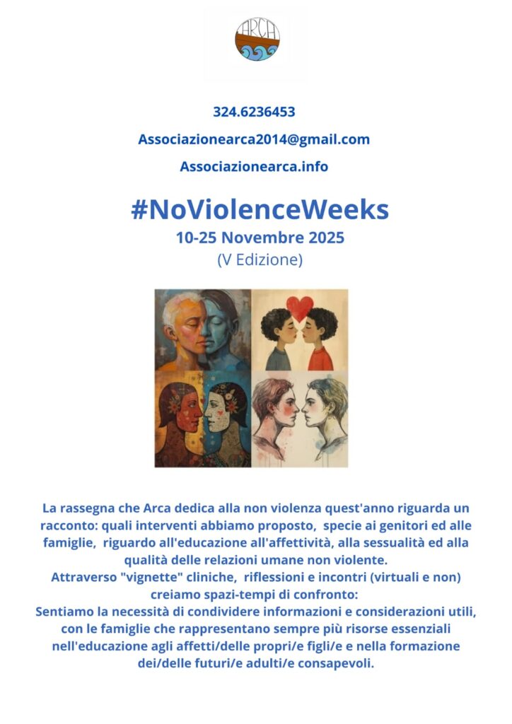 L’edizione di quest’anno delle #noviolenceweeks nasce dall’esigenza di Arca di dire la propria su una questione a noi molto cara, un’azione formativa/informativa a cui abbiamo dedicato due Edizioni precedenti (2022 e 2023) ma che nelle ultime settimane del 2025 si è rivelata centralissima